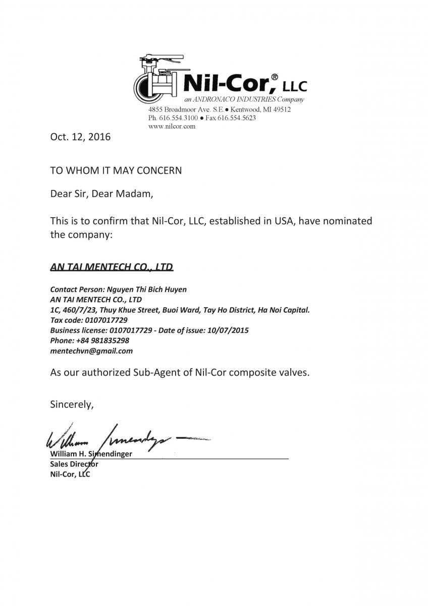 Công ty Mentech hiện đang là nhà phân phối duy nhất cho hãng van Nil-cor của Mỹ tại Việt Nam. Quý khách hàng có nhu cầu về các sản phẩm van Bi Nil-cor vui lòng liên hệ để có báo giá tốt nhất.